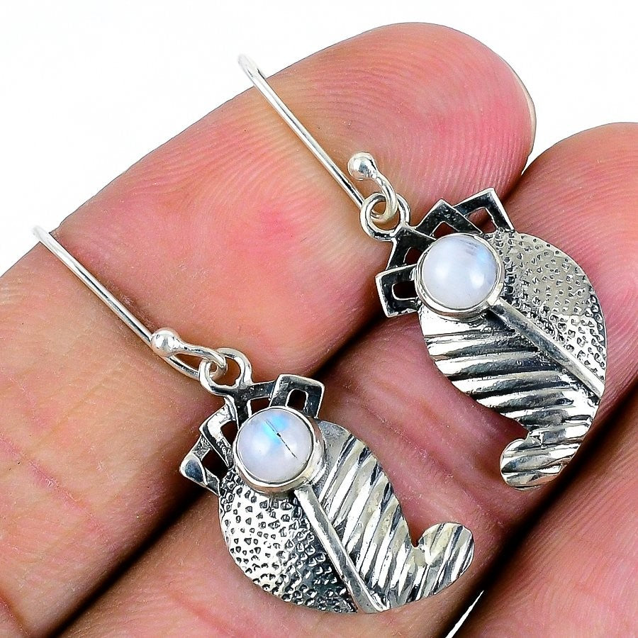 Moonstone Gemstone Solid Silver Art Deco Boho Dangle Mother Hook Bezel Earrings