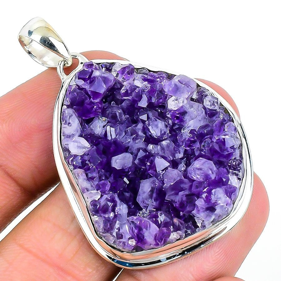 Amethyst Druzy Gemstone Sterling Silver Daughter Bezel Art Deco Trendy Pendant