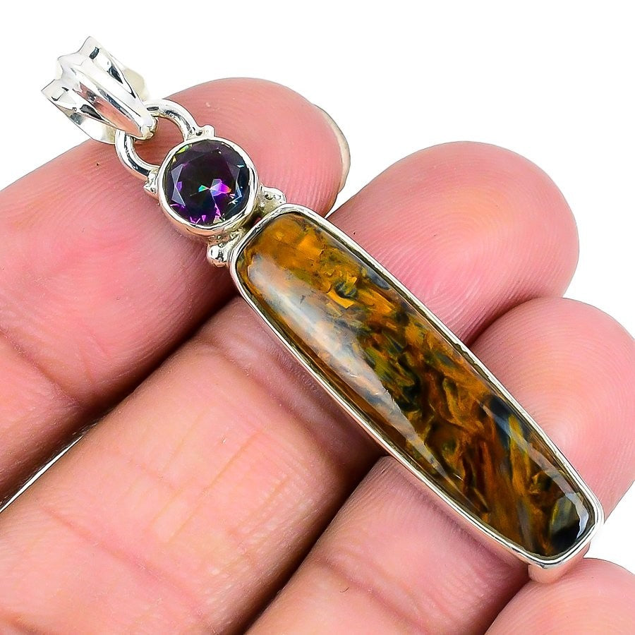 Pietersite Gemstone Sister Bezel Birthday Engagement Art Deco Pendant 925 Silver