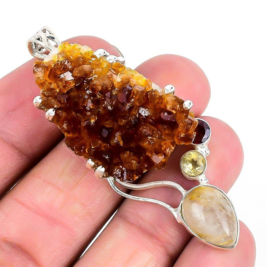 Citrine Druzy Stone Unique Handcrafted Bezel New Pendant Jewelry Solid Silver
