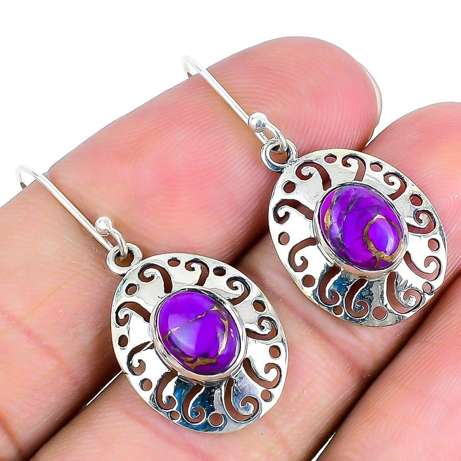 Copper Purple Turquoise Gemstone Sterling Silver Wife Dangle Drop Bezel Earrings