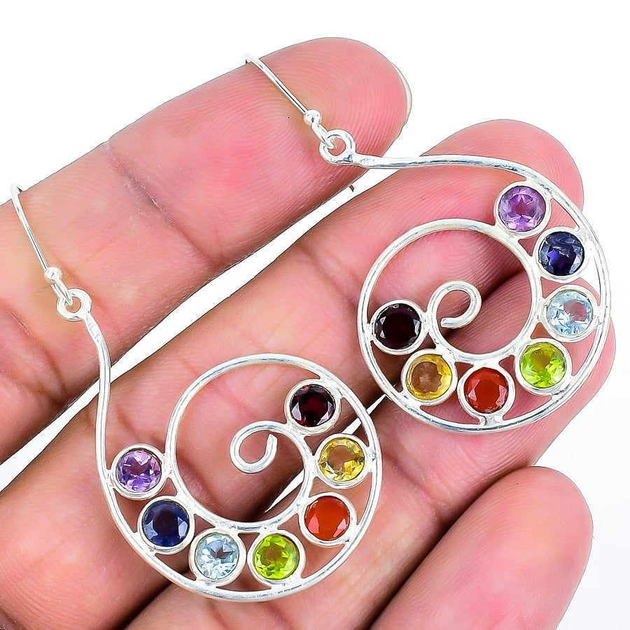Seven Chakra Gemstone Hook Dangling Engagement Sisters Gift Earrings 925 Silver