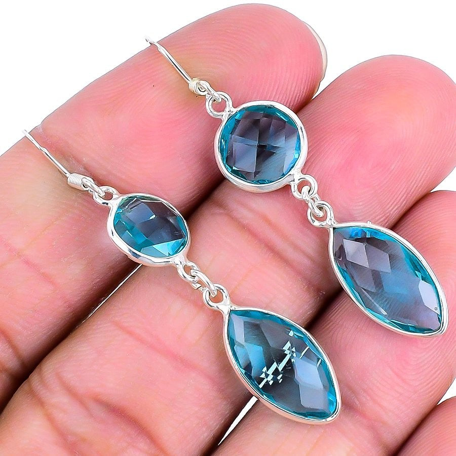 Blue Topaz Treated Glass Stone Solid Sterling Silver Bezel Dangle Wife Earrings