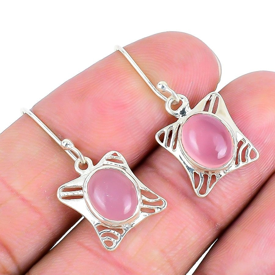 Rose Quartz Stone Solid Sterling Silver Handcrafted Hook Drop Ethnic Earrings
