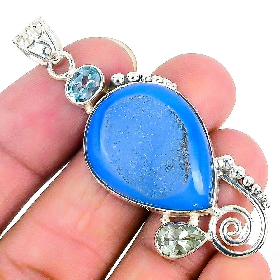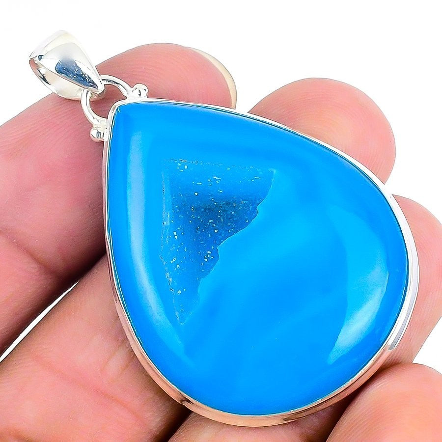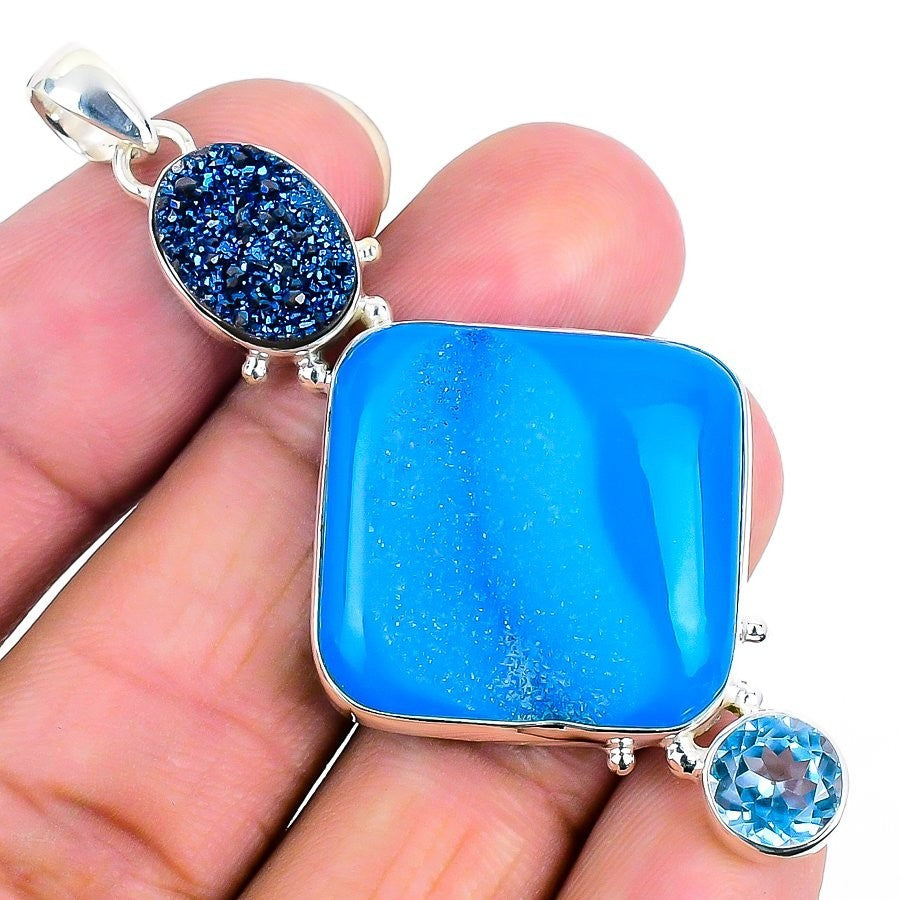 Blue Druzy Gemstone 925 Sterling Silver Bezel Sister Ethnic Birthday New Pendant