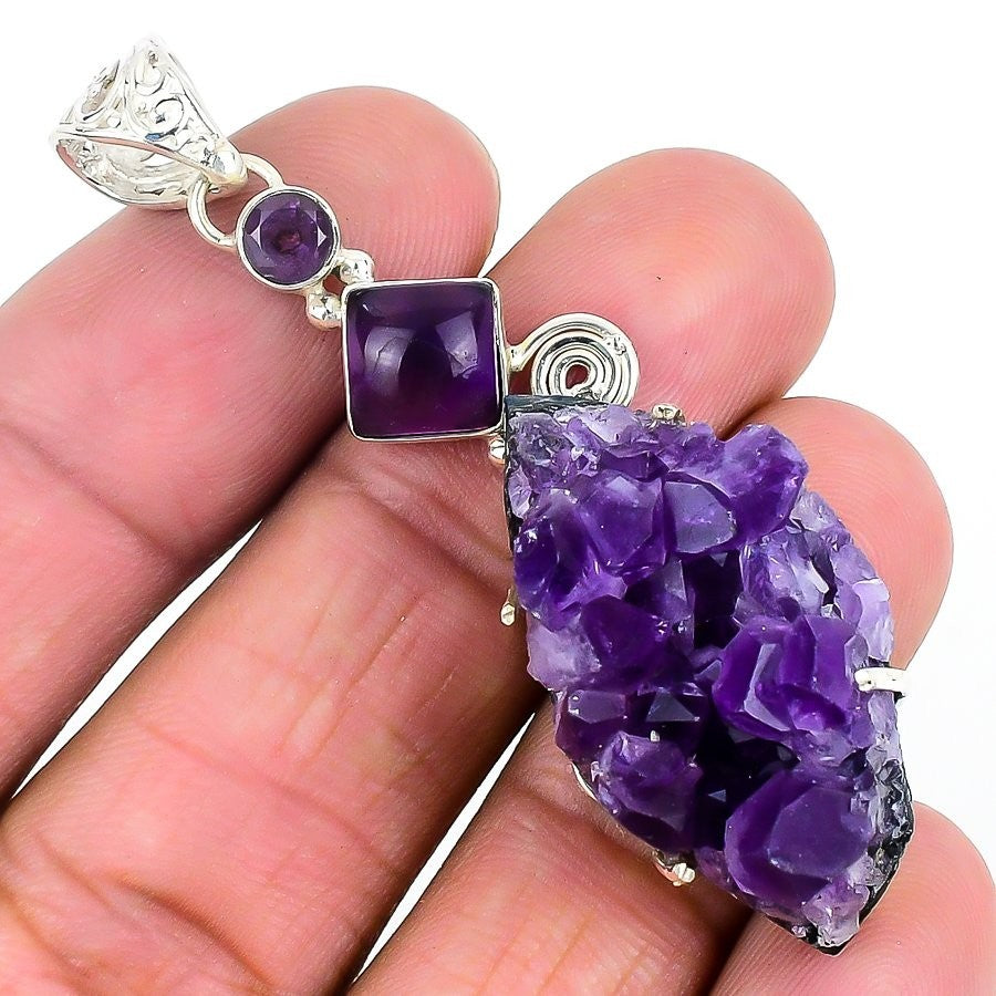Friendship Day Deal Natural Amethyst Druzy 925 Sterling Silver Pendant Jewelry