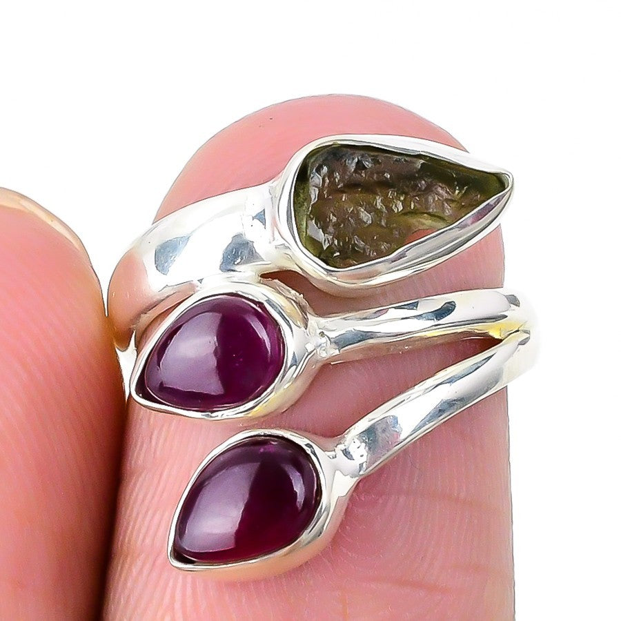 Sisters Day Sale Moldavite Gemstone Cluster Boho Mother Ring Size 7.5 925 Silver