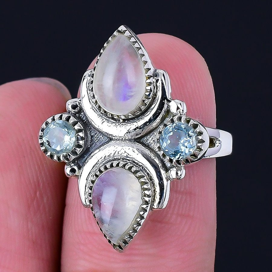 Rainbow Moonstone Gemstone 925 Silver Ethnic Sister Cluster Boho Ring Size 10