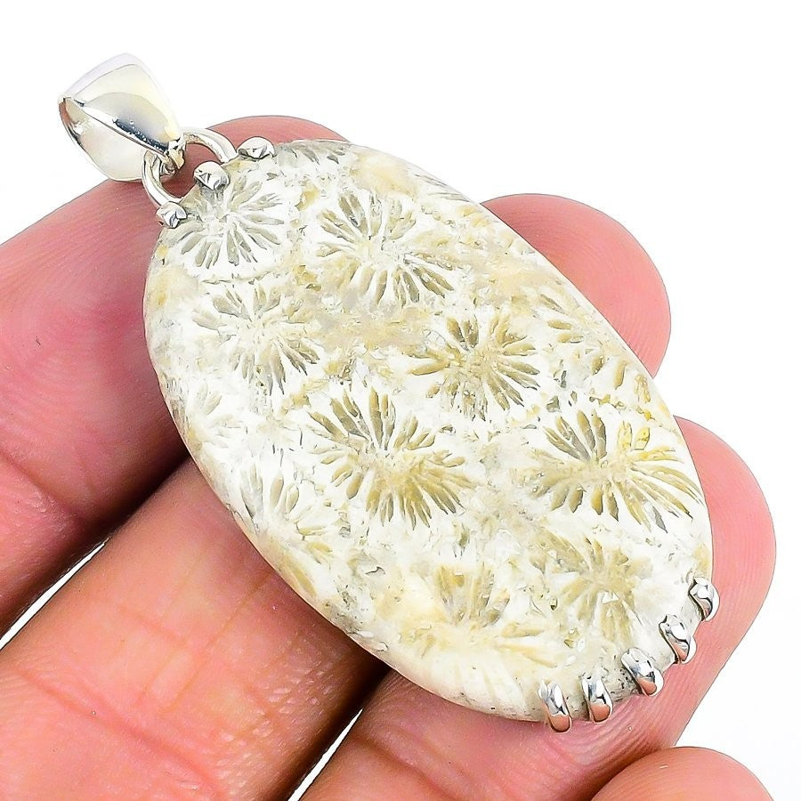 Fossil Coral Gemstone 925�Solid�Silver Sister Root Chakra Artisan Boho Pendant