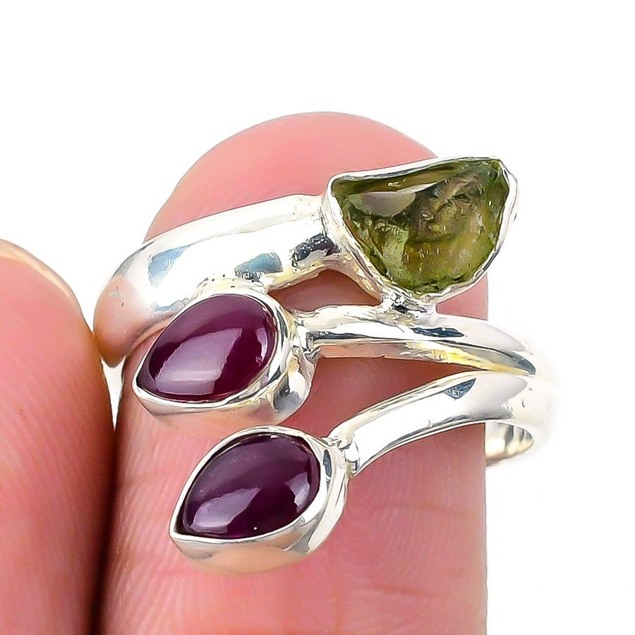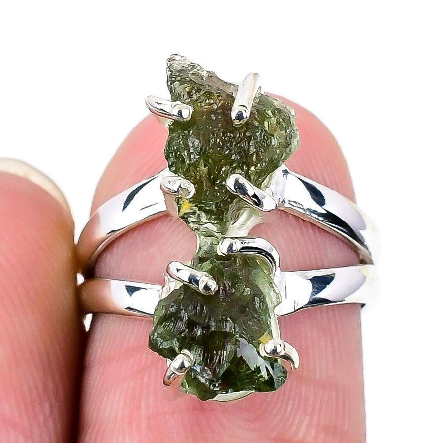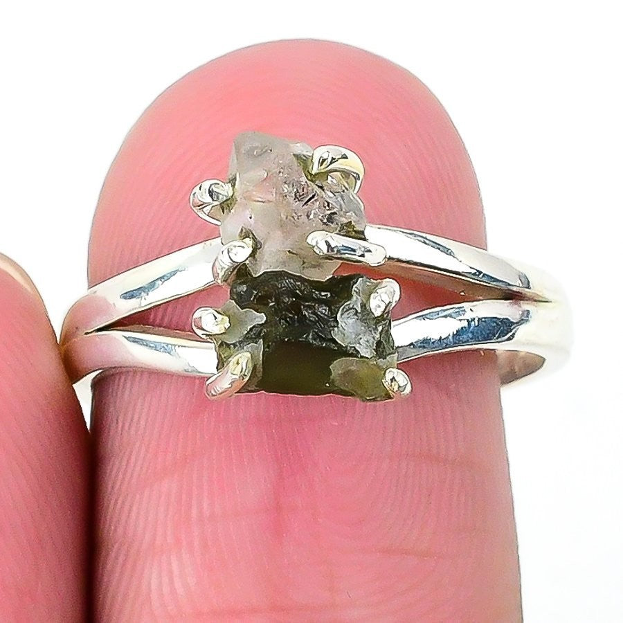 Moldavite Gemstone Wife Cluster Friendship Day Ring Size 9 Solid Sterling Silver