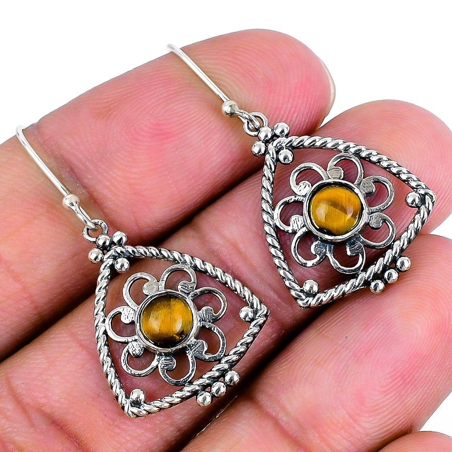 Tiger Eye Gemstone Solid Silver Artisan Drop Dangle New Ethnic Earrings Jewelry