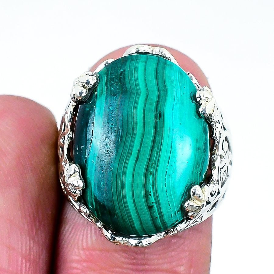 Natural Malachite Solid Silver Trendy Statement Artisan Band Ring Jewelry US 7