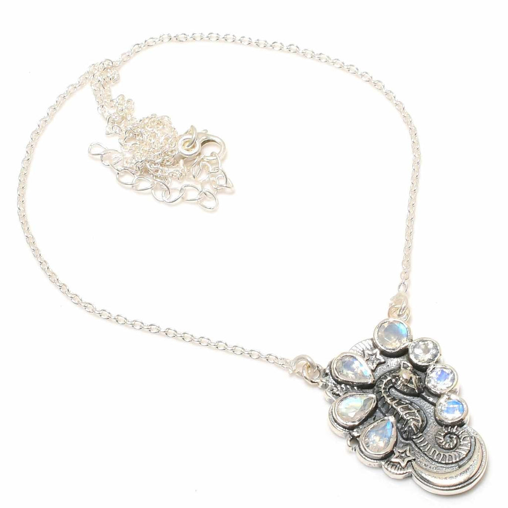 Crown Chakra Rainbow Moonstone Stone 925 Silver Chain Art Deco Necklace Jewelry