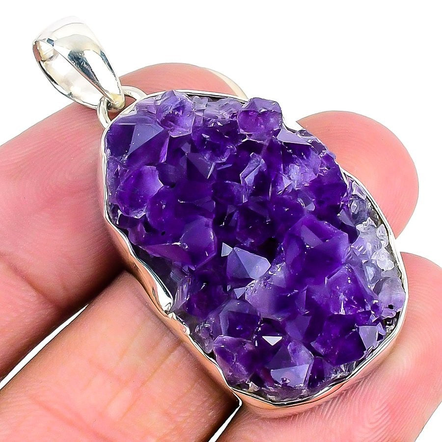 Natural Amethyst Druzy 925Ā SolidĀ Silver Sister Bezel Anniversary Wedding Pendant