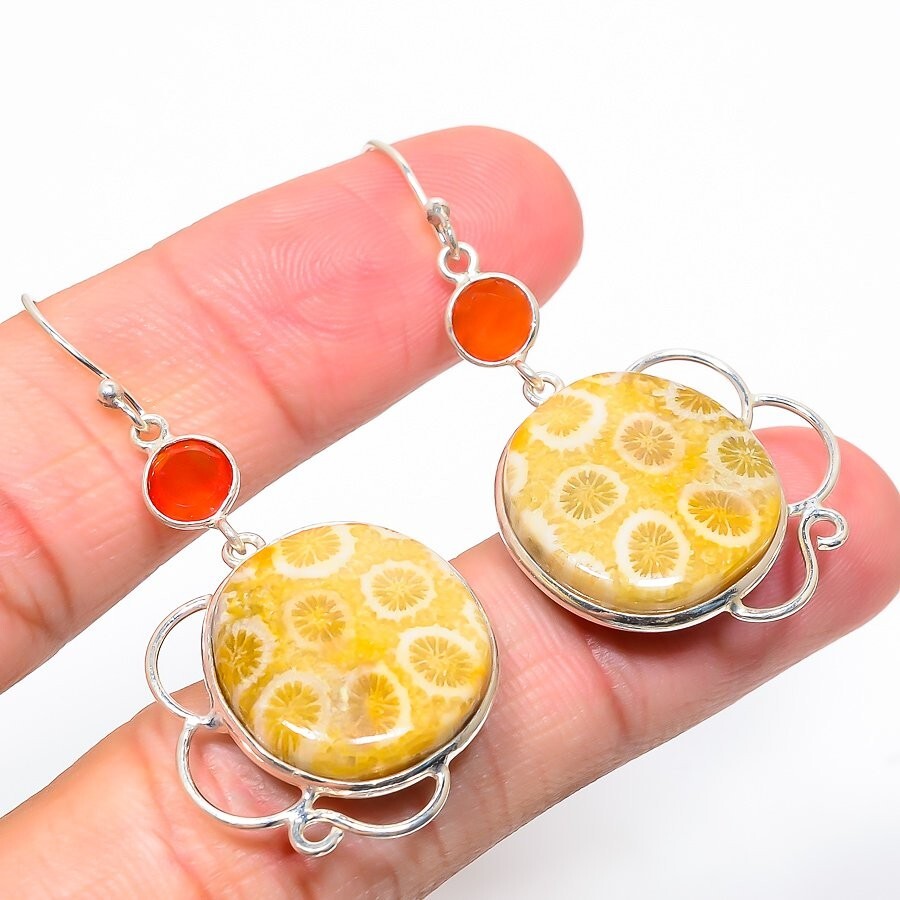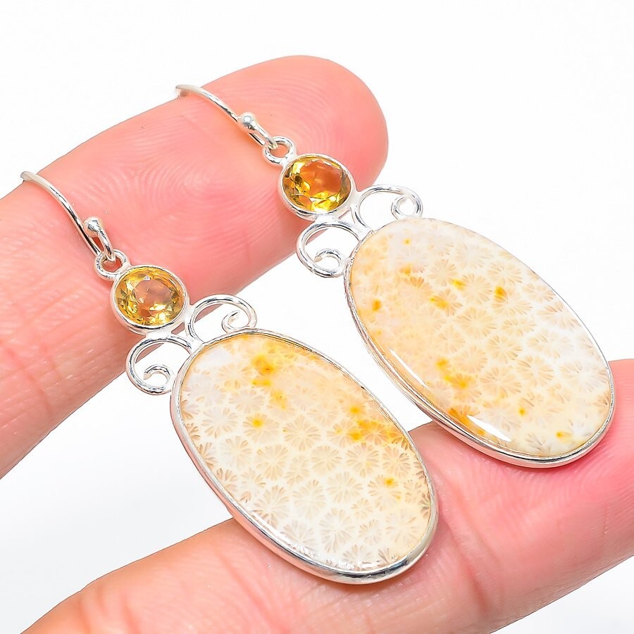 Natural Fossil"Coral 925 Silver Anniversary Dangle Daughter Hook Unique Earrings