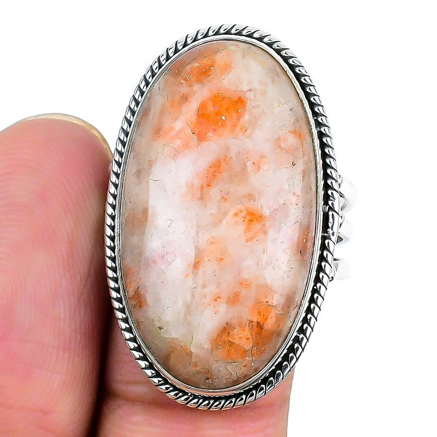 Sunstone Gemstone 925 Solid Silver Engagement Art Deco Statement Ring Size 9.5