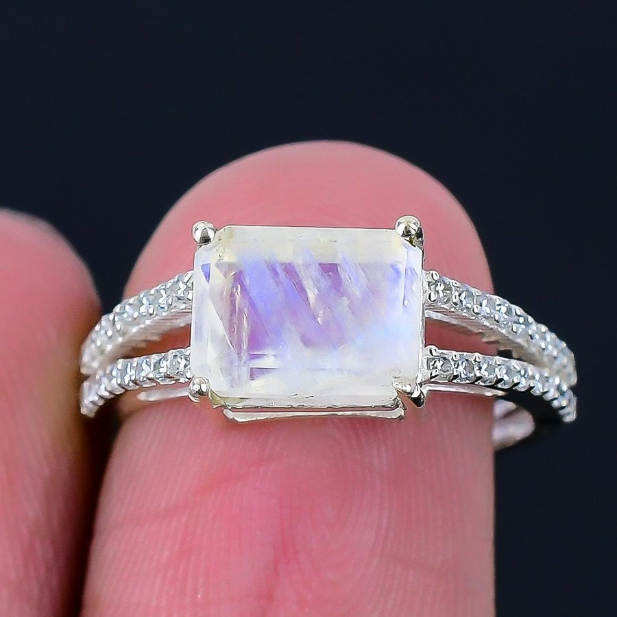Natural Rainbow Moonstone Solid Sterling Silver Statement Wedding Ring Jewelry