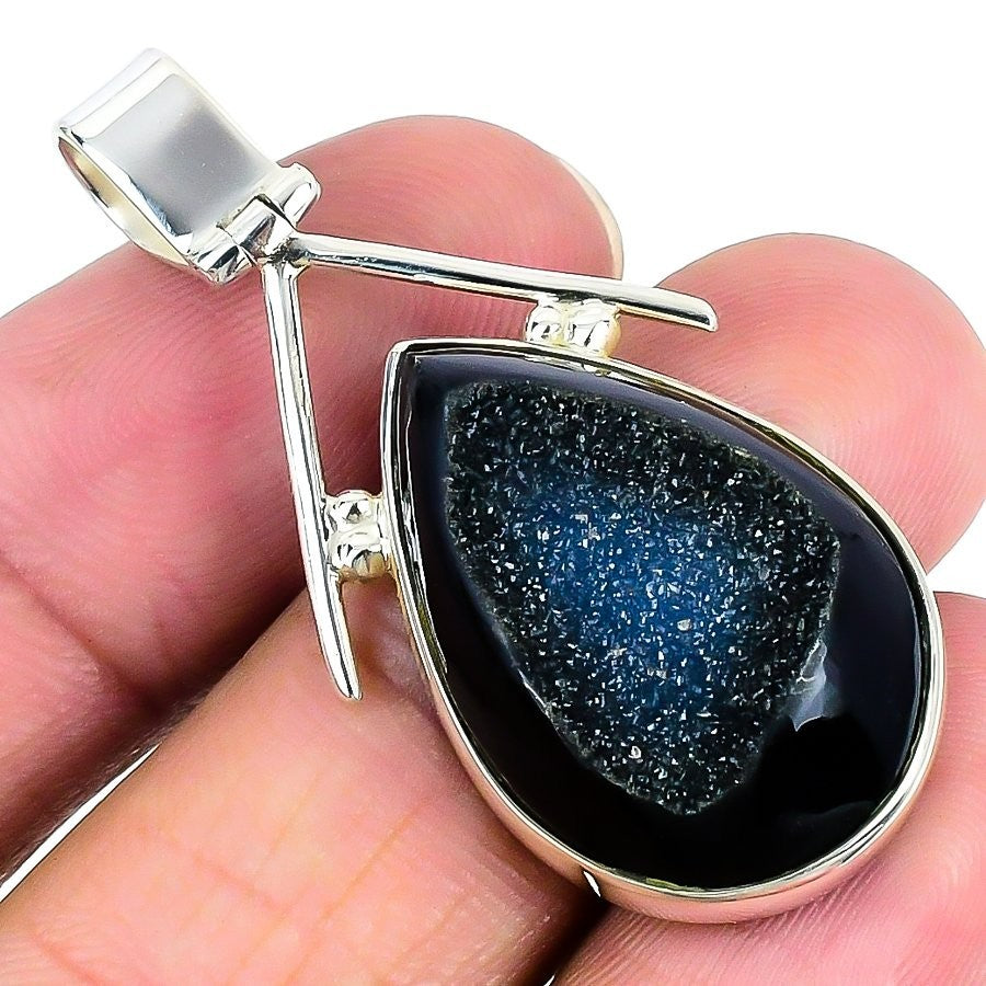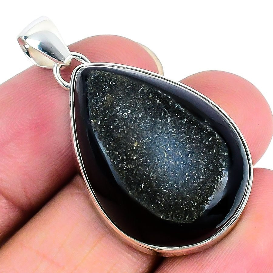 Black Druzy Stone Solid Sterling Silver Anniversary Bezel Mother Pendant Jewelry