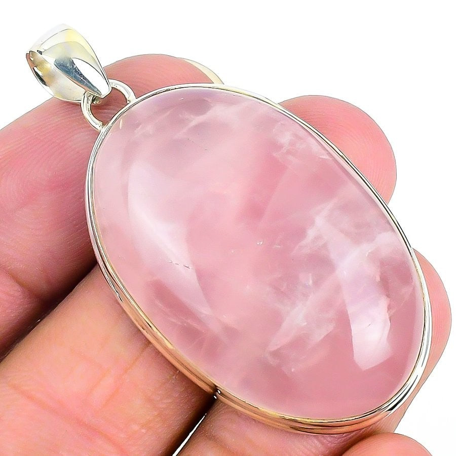 Heart Chakra Rose Quartz Gemstone Wife Bezel Handmade Pendant 925Ā SolidĀ Silver