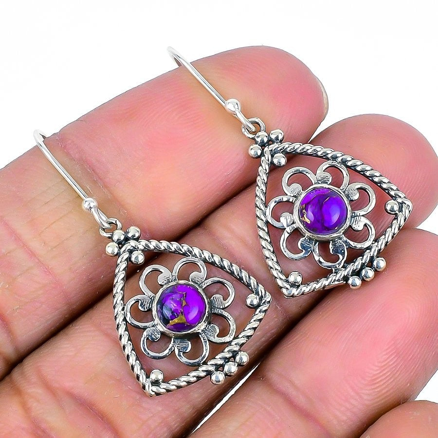 Natural Copper Purple Turquoise Sterling Silver Birthday Dangle Unique Earrings