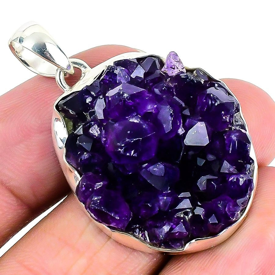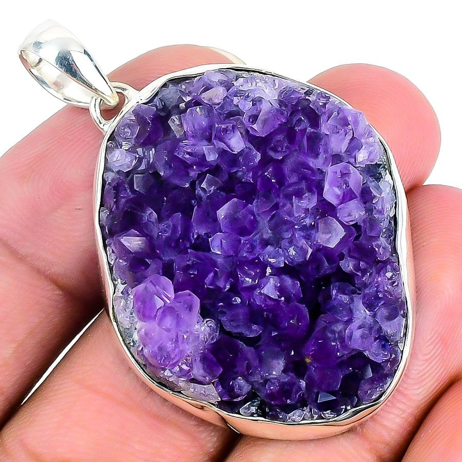 Natural Amethyst Druzy 925 Solid Silver Art Deco Friend Gift Birthday Pendant