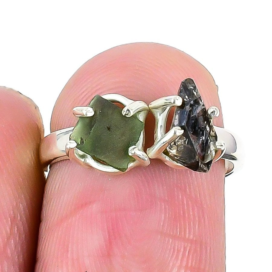 Natural Moldavite Quartz 925 Sterling Silver Handmade Cluster Sister Ring Size 6