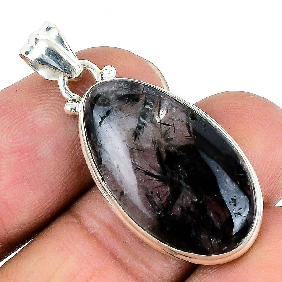 Natural Black Rutile Birthday Mother Bezel Wedding Pendant Solid Sterling Silver