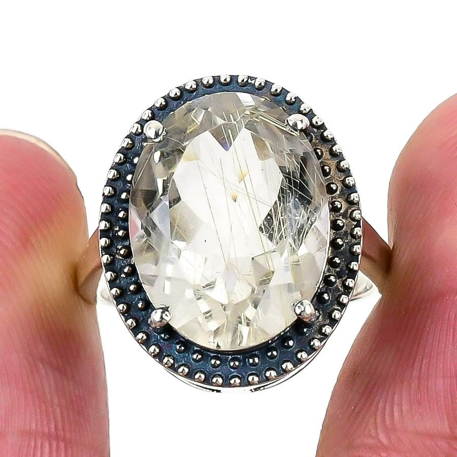Golden Rutile Stone Solid Sterling Silver Engagement Wife Statement Ring Size 7