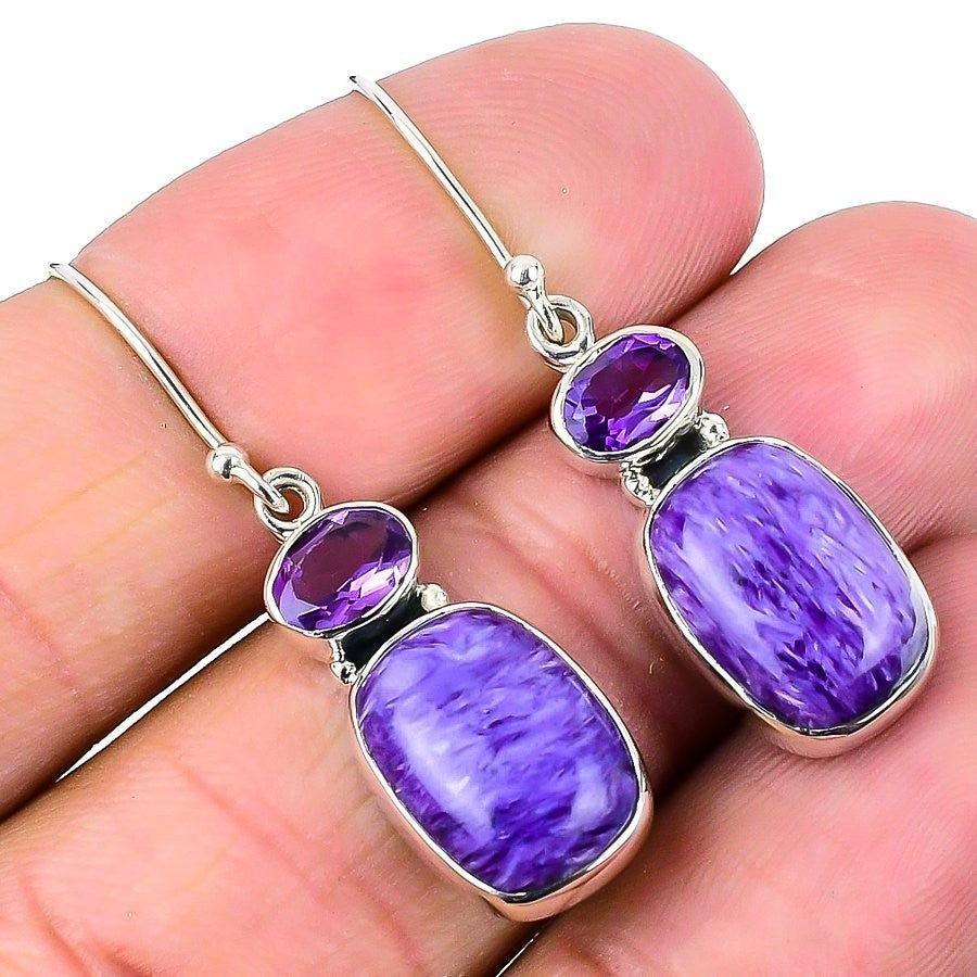 Russian Charoite Stone 925 Silver Handmade Dangle Hook Artisan Earrings Jewelry