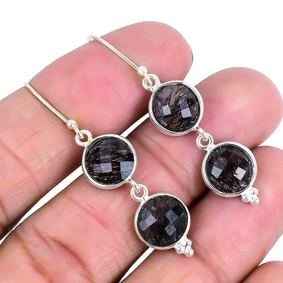 Natural Black Rutile Wife Dangle Drop Handcrafted Boho Earrings 925Ā SolidĀ Silver