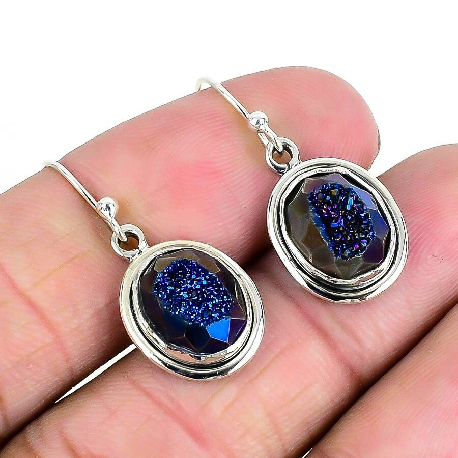 Titanium Druzy Gemstone 925Ā SolidĀ Silver Dangle Drop Sister Engagement Earrings