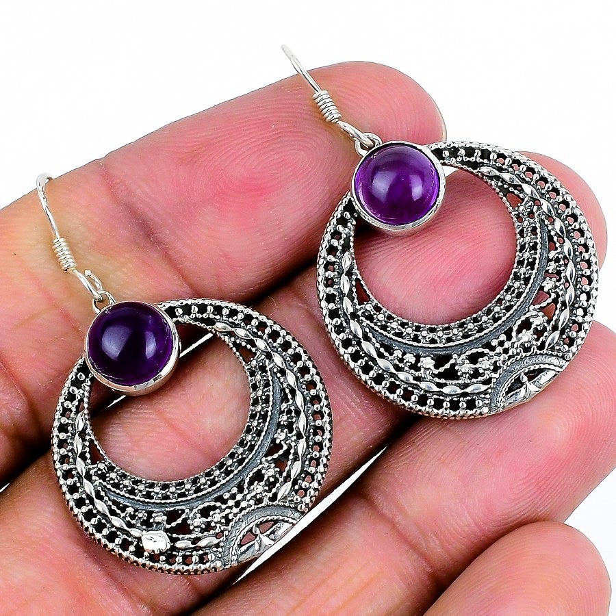 Sage Amethyst Gemstone Solid Silver Bezel Hook Boho Dangle Crown Chakra Earrings