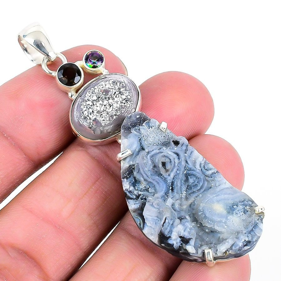Sisters Day Sale Natural Desert Rose Druzy Ethnic Art Deco Pendant 925 Silver