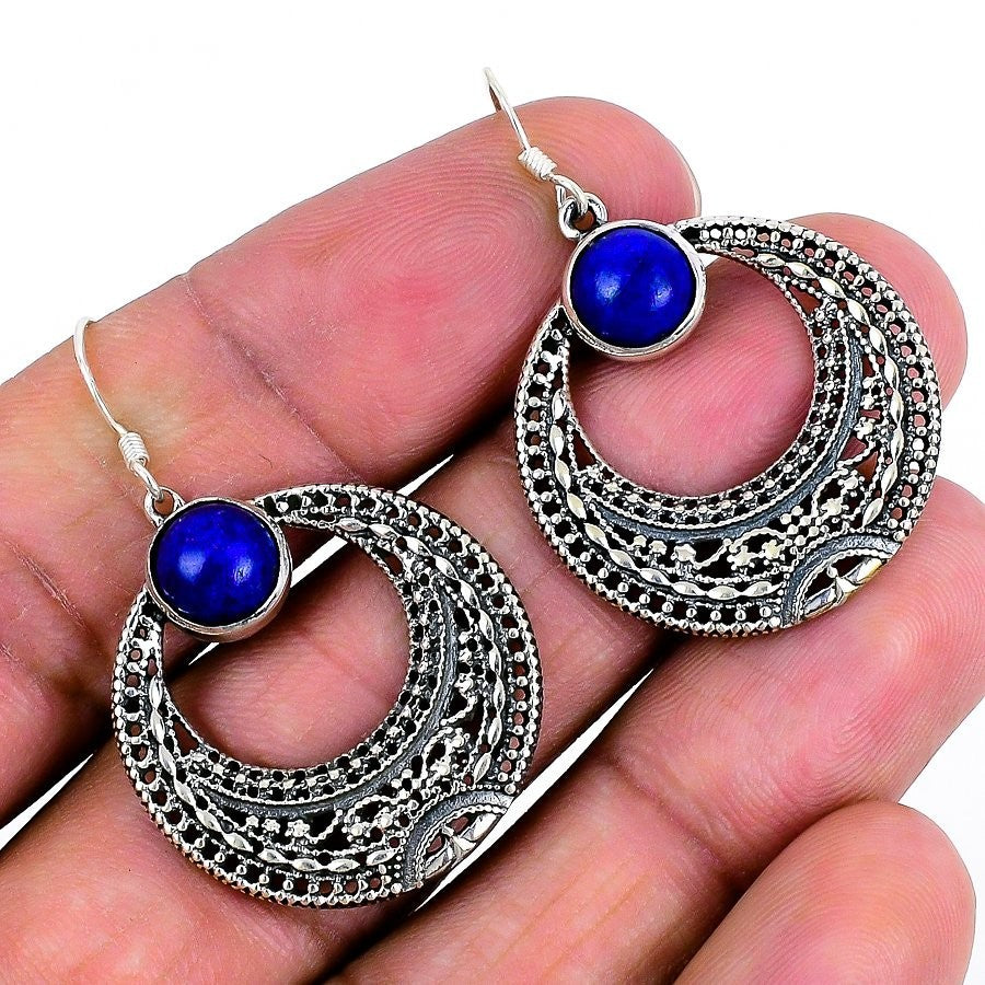 Natural Lapis Lazuli Bezel Dangling Hook Boho Earrings Jewelry 925Ā SolidĀ Silver