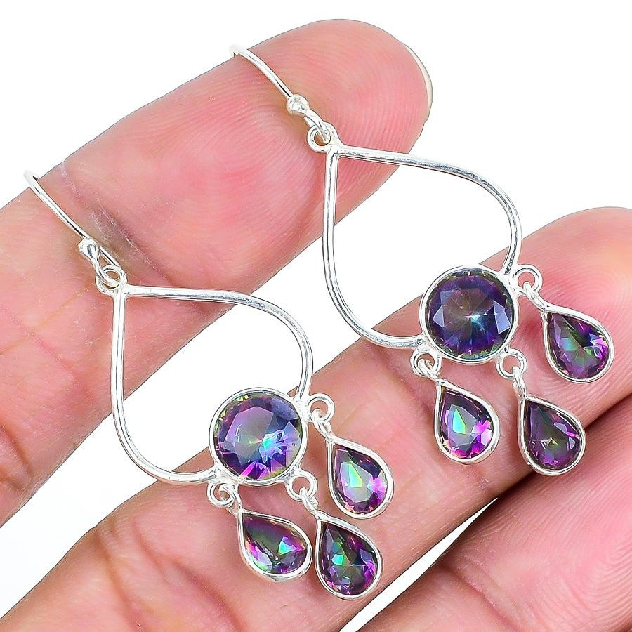 Mystic Topaz Gemstone Sterling Silver Bezel Dangle Birthday Friend Gift Earrings