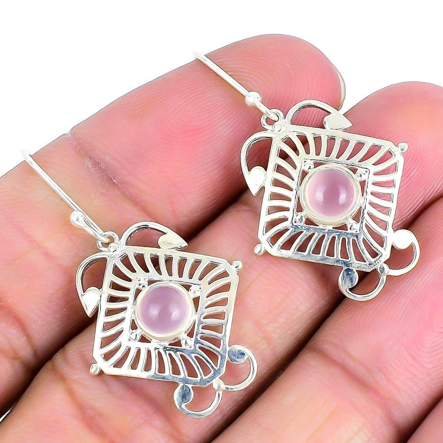Rose Quartz Gemstone Unique Dangle Heart Chakra Earrings Jewelry Sterling Silver