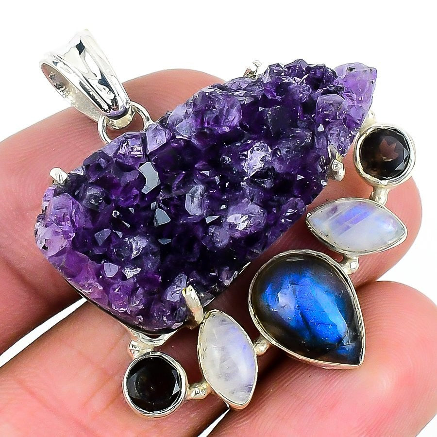 Sisters Day Sale Amethyst Druzy Gemstone Mother Pendant Jewelry 925Ā SolidĀ Silver