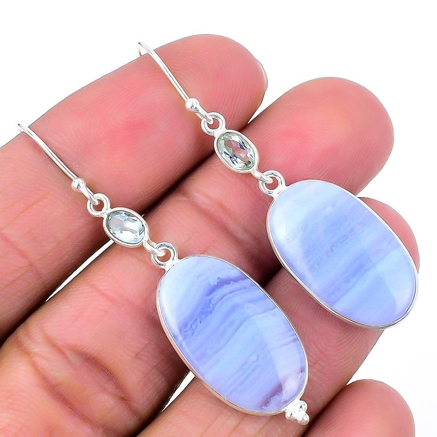Blue Lace Agate Stone Wife Hook Dangling Earrings Jewelry Solid Sterling Silver