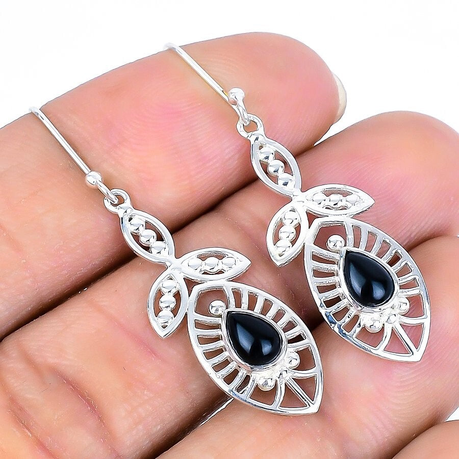 Root Chakra Black Onyx Stone Solid Sterling Silver Dangle Drop Earrings Jewelry