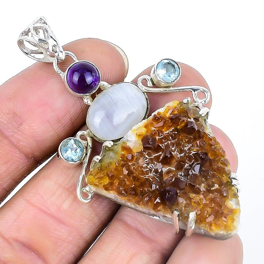 Citrine Druzy Stone Wife Engagement Unique Ethnic Pendant Solid Sterling Silver