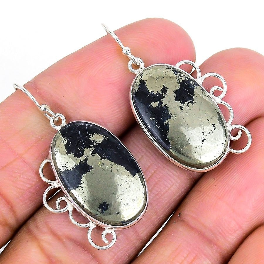 Pyrite Agate Gemstone 925 Sterling Silver Dangling Channel Set Earrings Jewelry