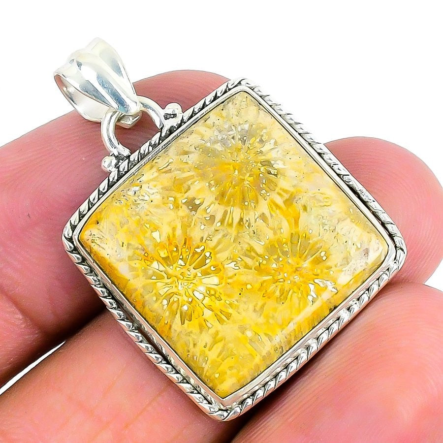 Fossil Coral Stone Engagement Root Chakra Pendant Jewelry Solid Sterling Silver