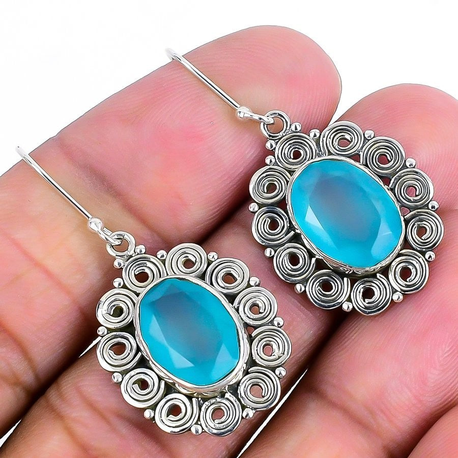 Natural Aqua Chalcedony Sterling Silver Bezel Birthday Dangle Earrings Jewelry