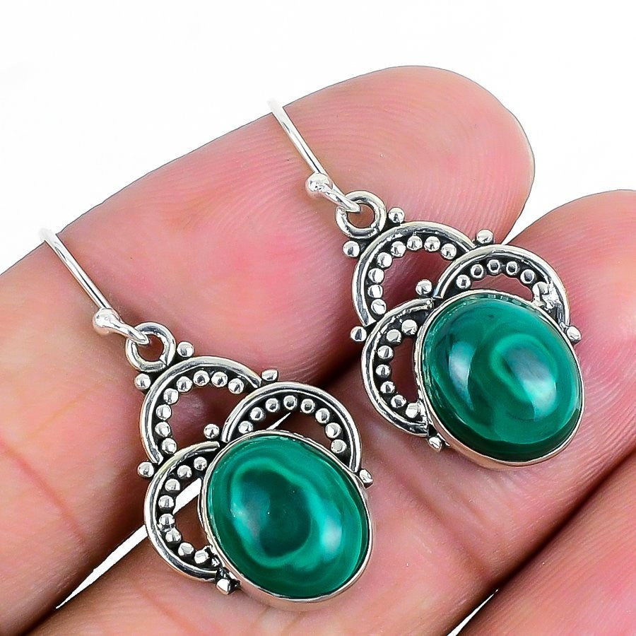 Heart Chakra Natural Malachite 925Ā SolidĀ Silver Dangle Drop Handmade Earrings