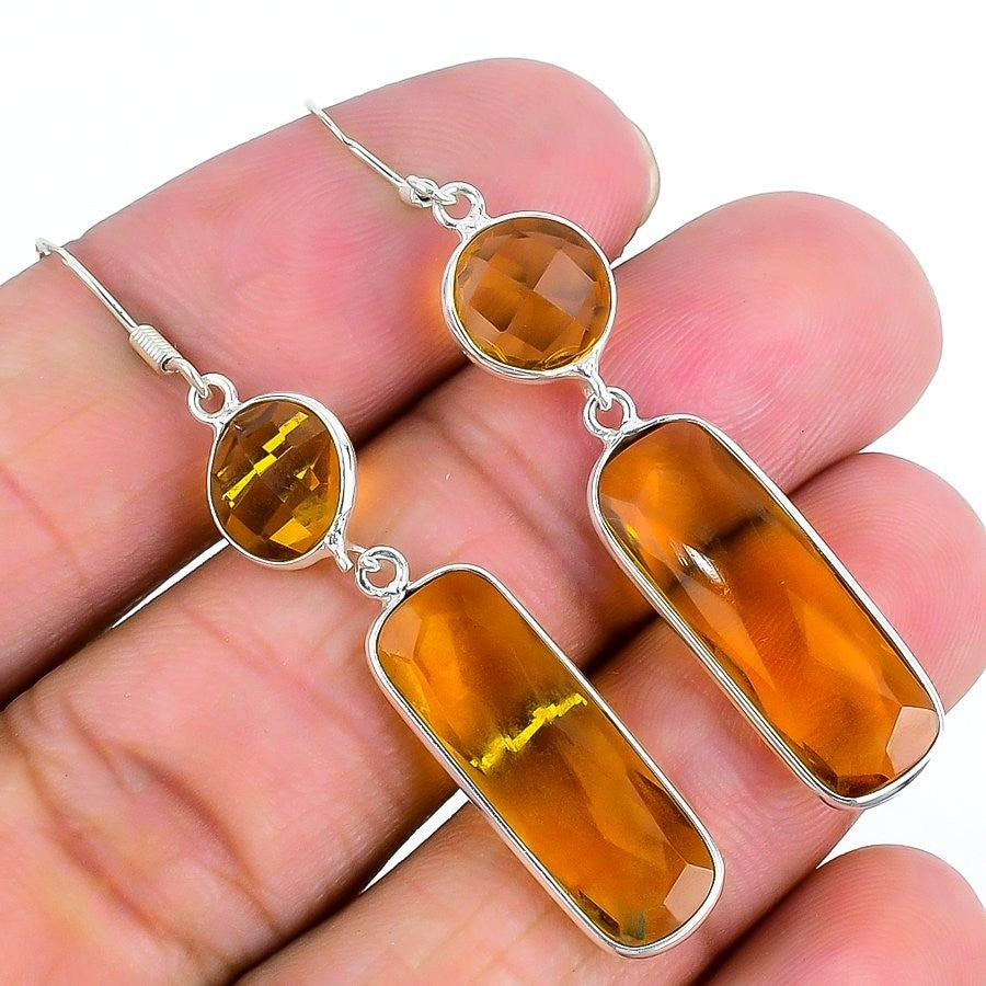 Natural Citrine Treated 925Ā SolidĀ Silver Artisan Daughter Dangling Hook Earrings