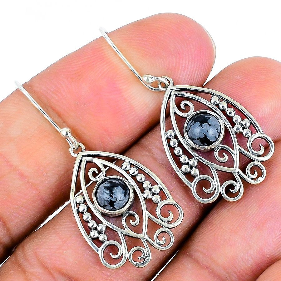 Snoflake Obsidian Gemstone Solid Silver Dangle Drop Handmade Earrings Jewelry