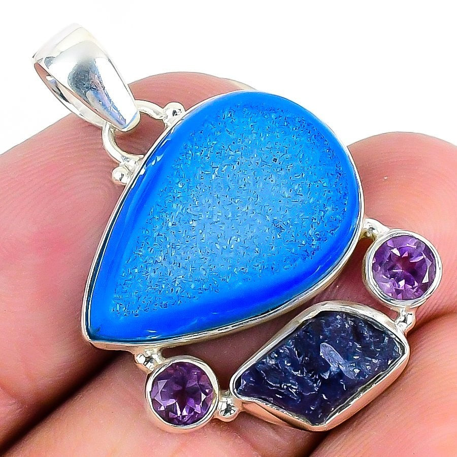Blue Druzy Stone Bezel New Daughter Elegant Trendy Pendant Jewelry Solid Silver