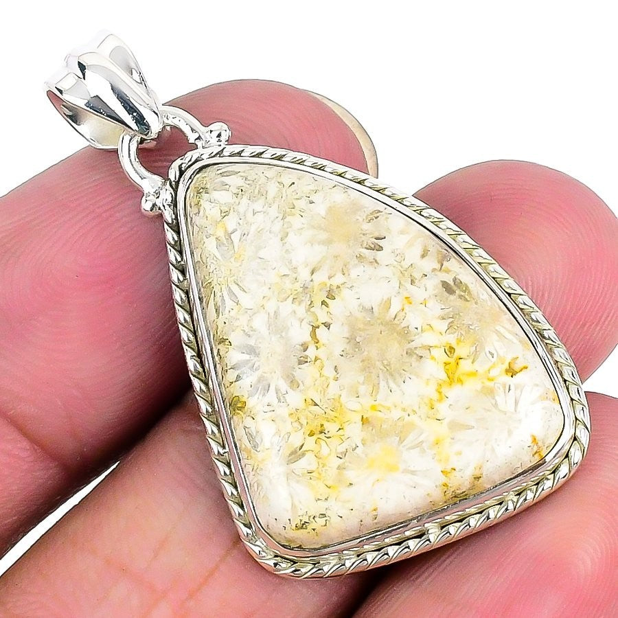 Fossil Coral Gemstone Root Chakra Anniversary Boho Pendant Solid Sterling Silver