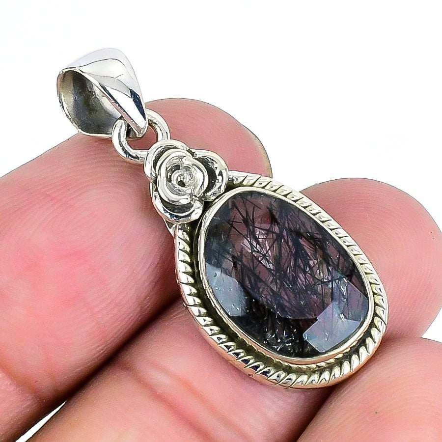 Black Rutile Stone Elegant Boho Engagement Birthday Pendant Jewelry Solid Silver