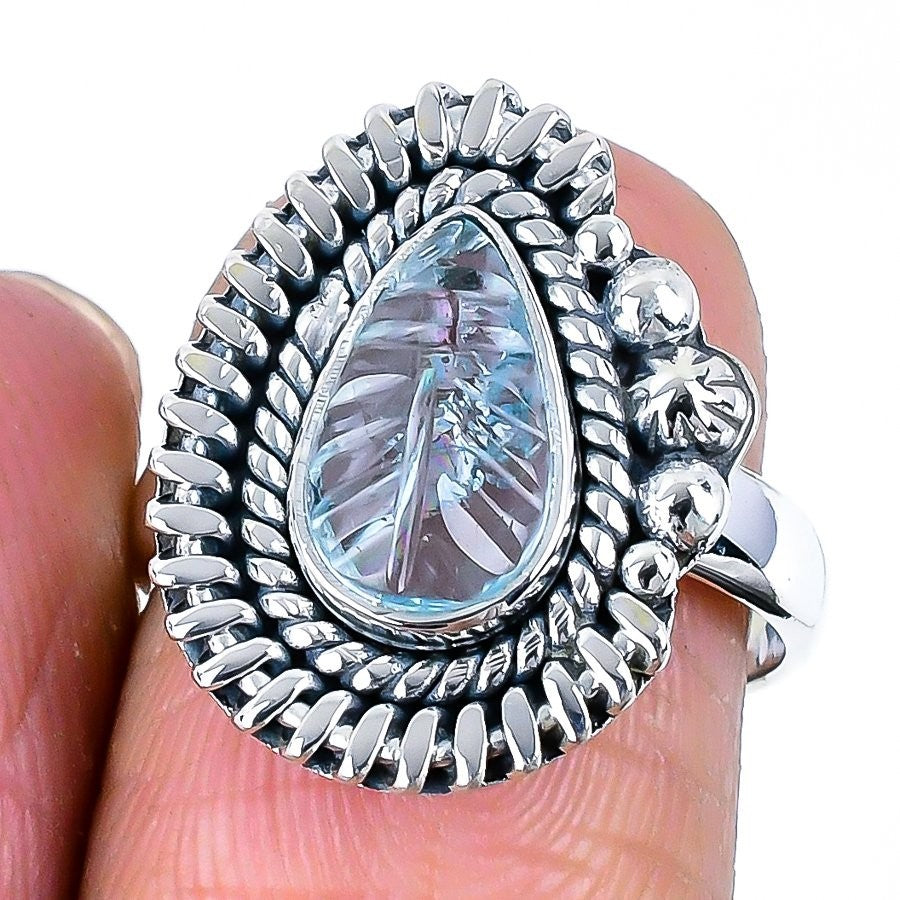 Natural Aquamarine Carving 925 Sterling Silver Statement Throat Chakra Ring US 7